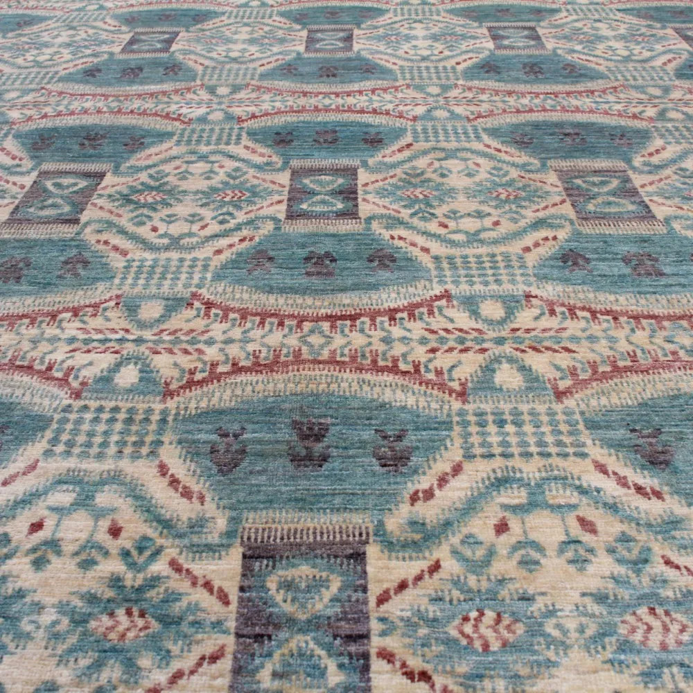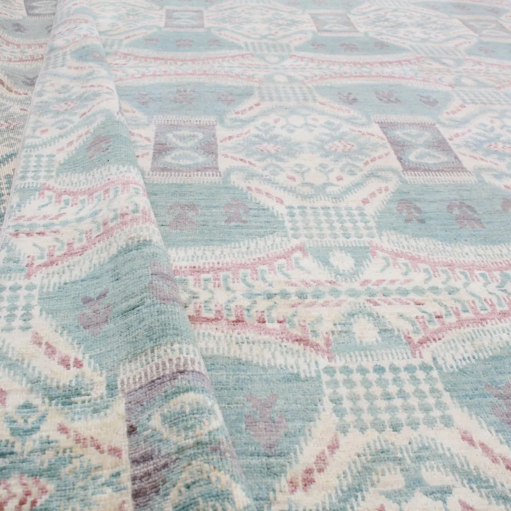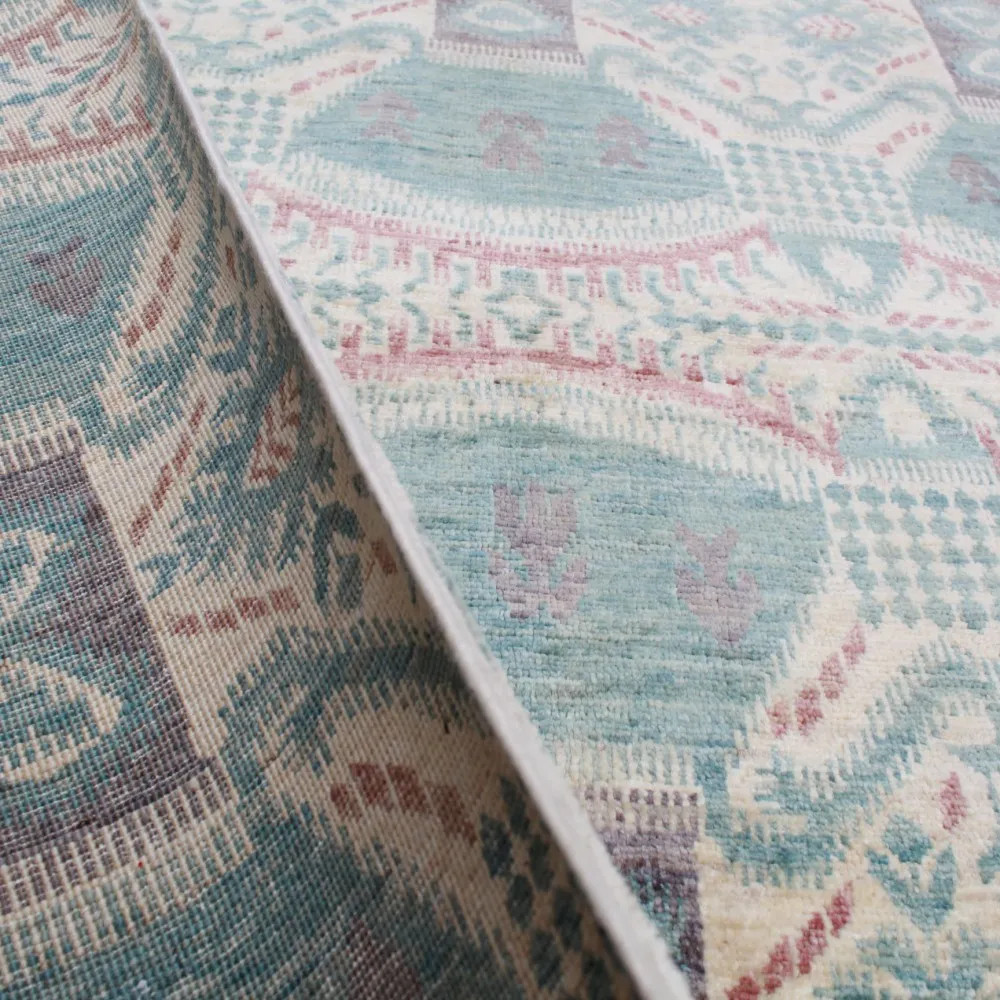 Tento koberec je ručně vázaný v Afghánistánu a je vyroben ze 100% vlny s bavlněnou osnovou. Jeho moderní vzory a barvy dodávají místnostem jedinečnou atmosféru. Díky své tloušťce 7-9 mm a váze 2,5 kg/m² je nejen esteticky přitažlivý, ale také praktický. Vlněný koberec Aikat je navíc barven přírodními barvivy, což zajišťuje dlouhodobou stálost barev. S rychlou dopravou po Česku, kterou nabízíme, můžete tento skvost mít doma během 2-3 pracovních dnů. Pokud hledáte koberec, který dodá vašemu interiéru teplo a styl, je tento koberec ideální volbou.